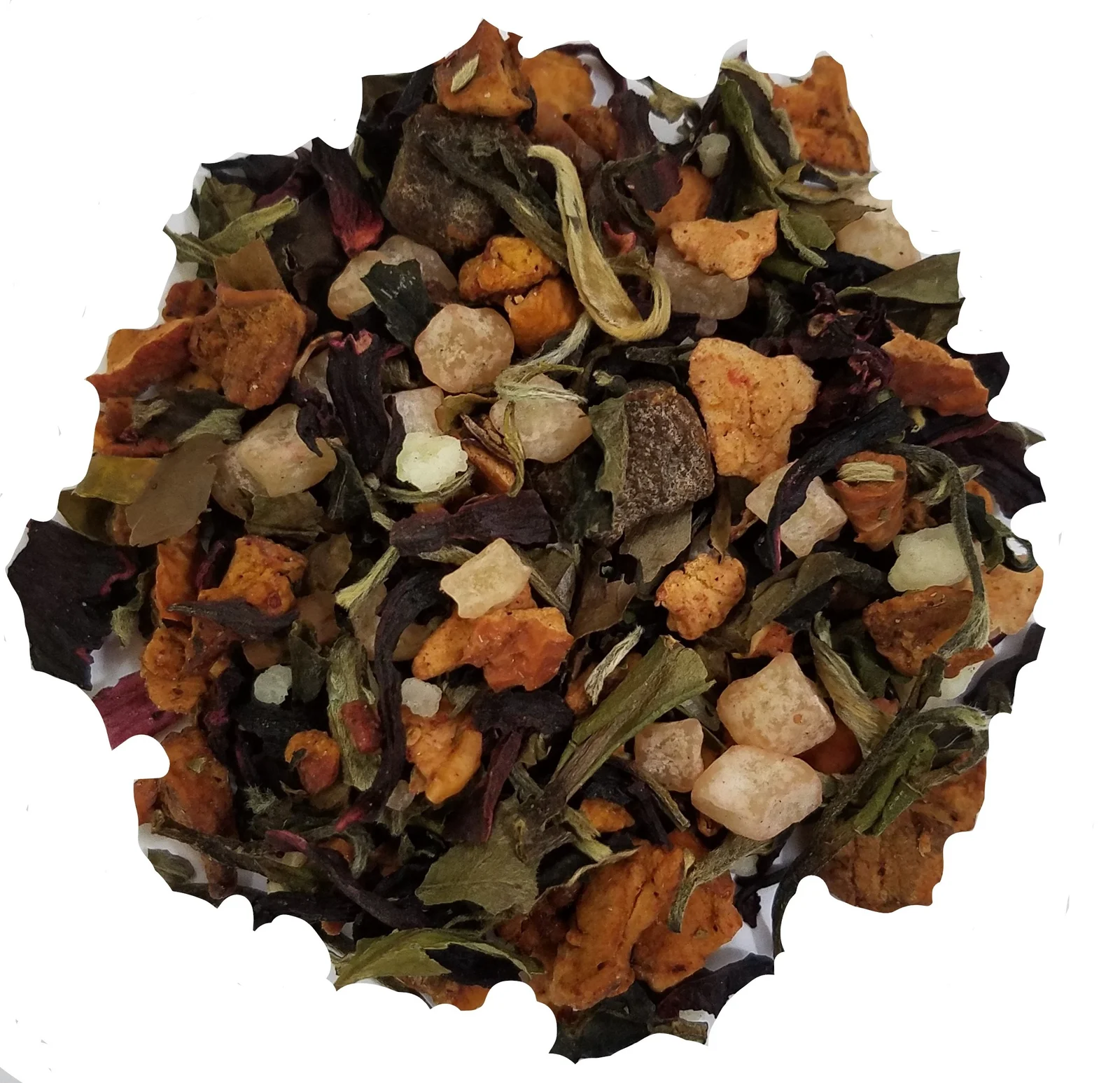 Ingredients– Pai Mu Tan white tea, apple pieces, pineapple cubes (pineapple, sugar), hibiscus blossoms, peach pieces (peach, rice flour), flavoring, freeze-dried peach pieces (peach, sugar), freeze-dried kiwi pieces.